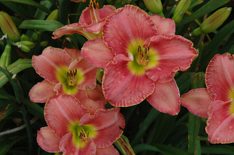 Scottish Fantasy Daylily features bold coral-pink trumpet-shaped flowers with pink overtones, lime green throats and a yellow ring at the ends of the stems in mid summer. The flowers are excellent for cutting. Its grassy leaves remain green in color throughout the season.