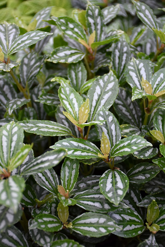 Rich, deep green oval leaves that look like they have been splashed with aluminum paint, hence the name; pinch stem tips to keep plant compact; a great annual base or edging plant; requiring only bright indirect light, this one is a great houseplant