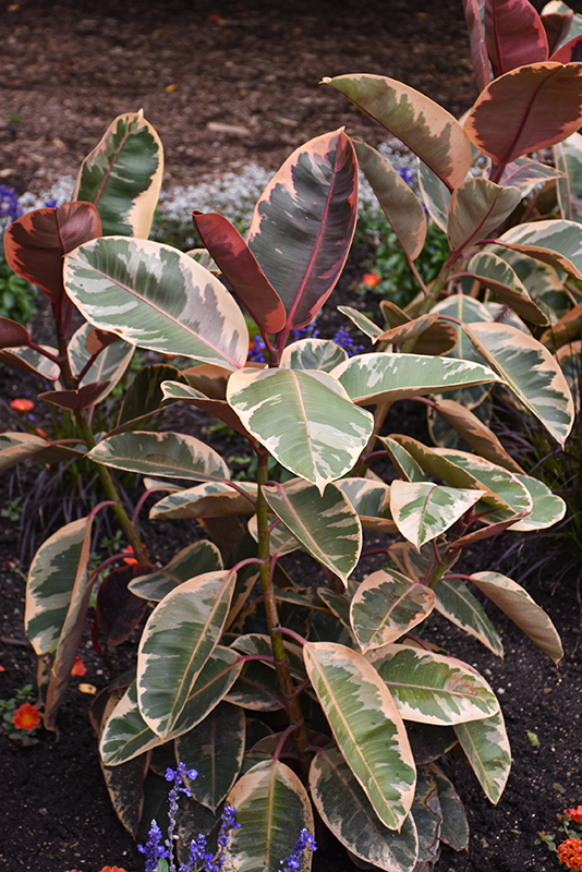 Tricolor Rubber Tree's attractive glossy oval leaves emerge rose, turning dark green in color with showy creamy white variegation and tinges of grayish green throughout the year on a plant with an upright spreading habit of growth.