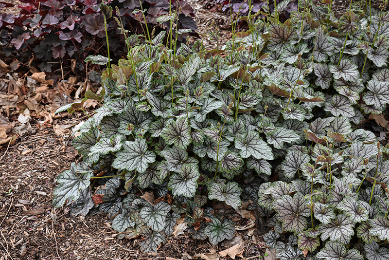 Green Spice Coral Bells will grow to be about 10 inches tall at maturity extending to 24 inches tall with the flowers, with a spread of 12 inches. When grown in masses or used as a bedding plant, individual plants should be spaced approximately 10 inches apart. Its foliage tends to remain low and dense right to the ground. It grows at a medium rate, and under ideal conditions can be expected to live for approximately 10 years. As an evegreen perennial, this plant will typically keep its form and foliage year-round.