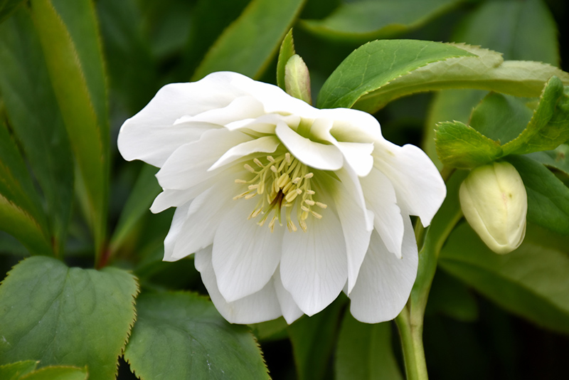Wedding Party® Wedding Bells Hellebore features showy nodding double white cup-shaped flowers with chartreuse eyes and buttery yellow anthers at the ends of the stems from late winter to early spring. Its glossy oval compound leaves remain bluish-green in color throughout the year.