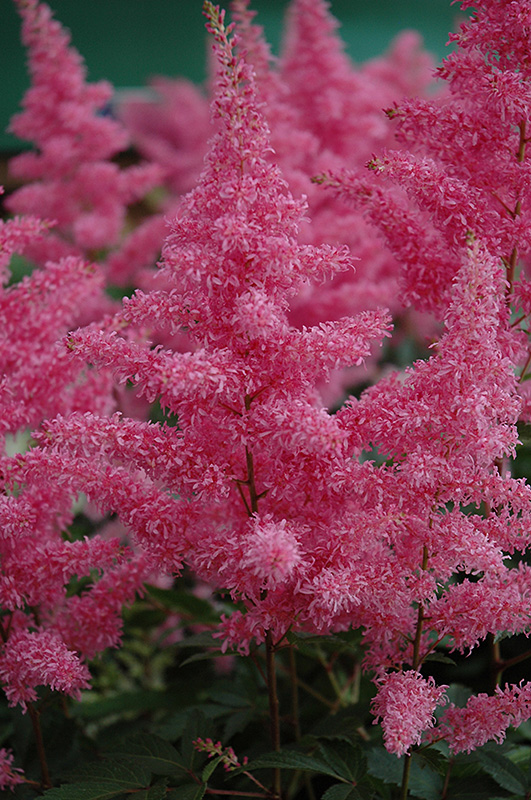Soft, showy plumes of raspberry pink, rising above glossy leaves; perfect in a shady spot with dappled light; prefers moisture so water regularly for abundant flowers and nice foliage