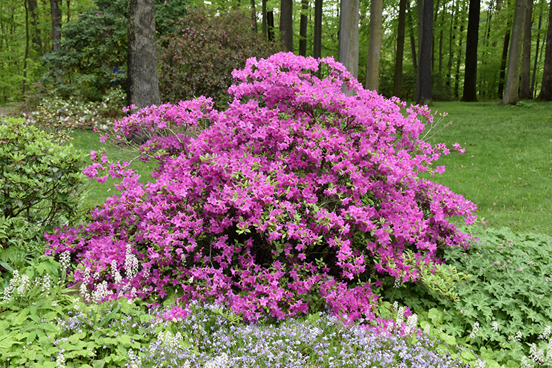 Karen Azalea is bathed in stunning clusters of lightly-scented lilac purple trumpet-shaped flowers with pink overtones at the ends of the branches in mid spring before the leaves. It has dark green deciduous foliage. The narrow leaves do not develop any appreciable fall color.